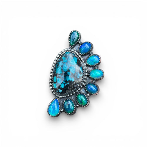 Hubei Web Turquoise with Smoked Welo Opal accents Half Cluster Adjustable Ring in Sterling Silver Median Size 7.5