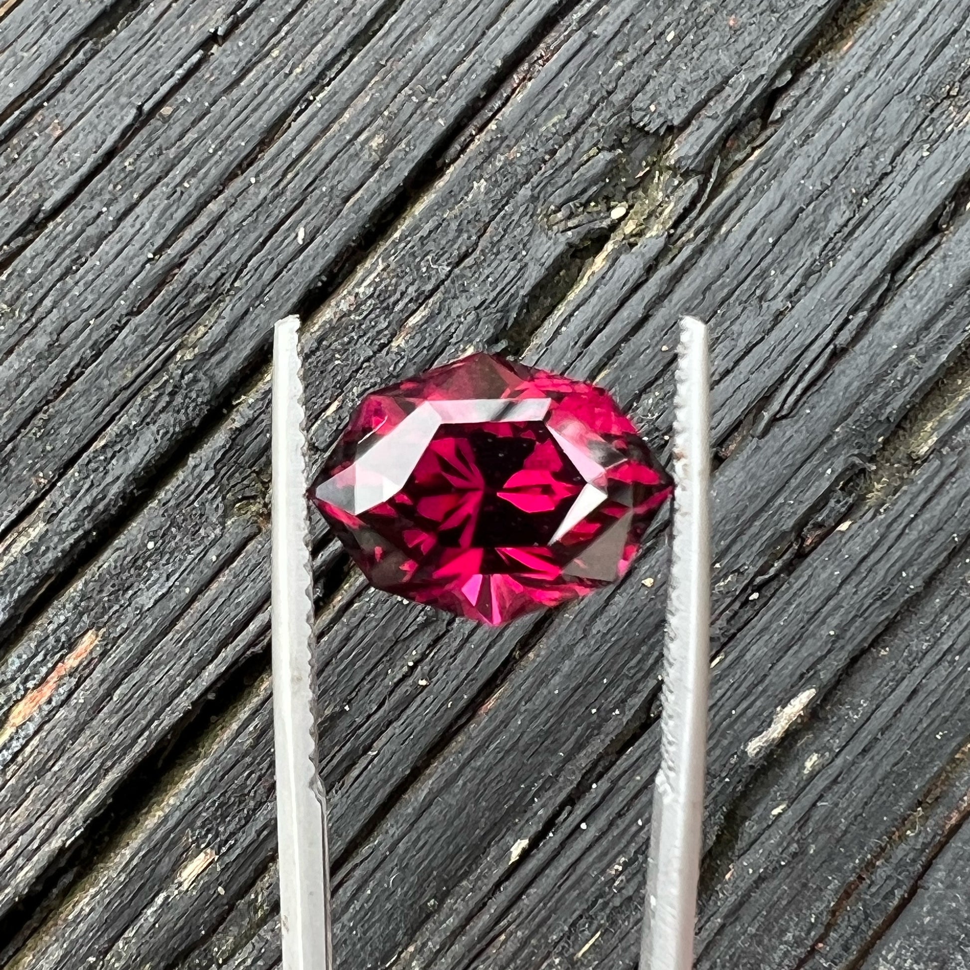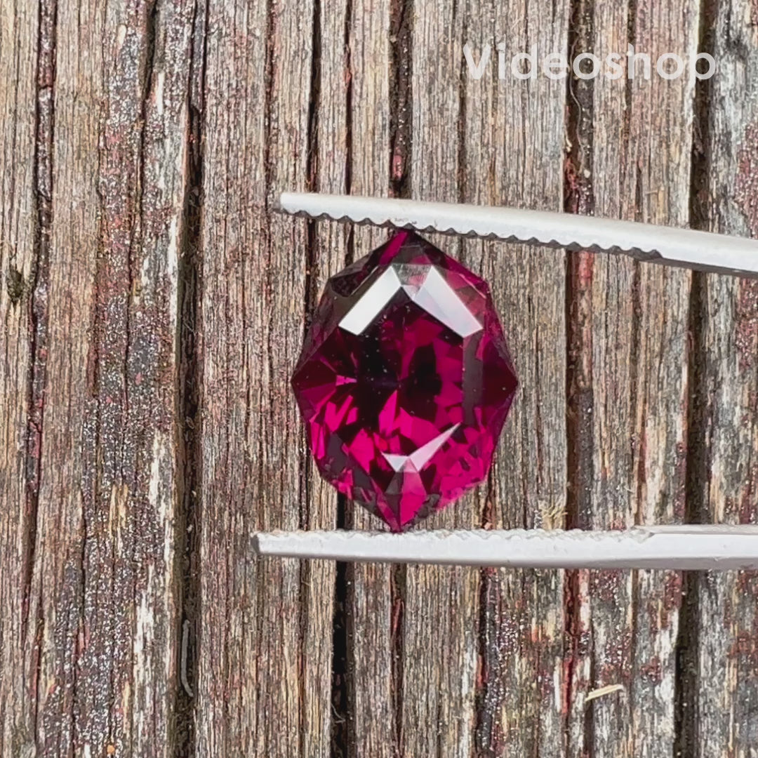 A stunning and huge purple rhodolite garnet from Tanzania cut in the Cape May Diamond Cut design.