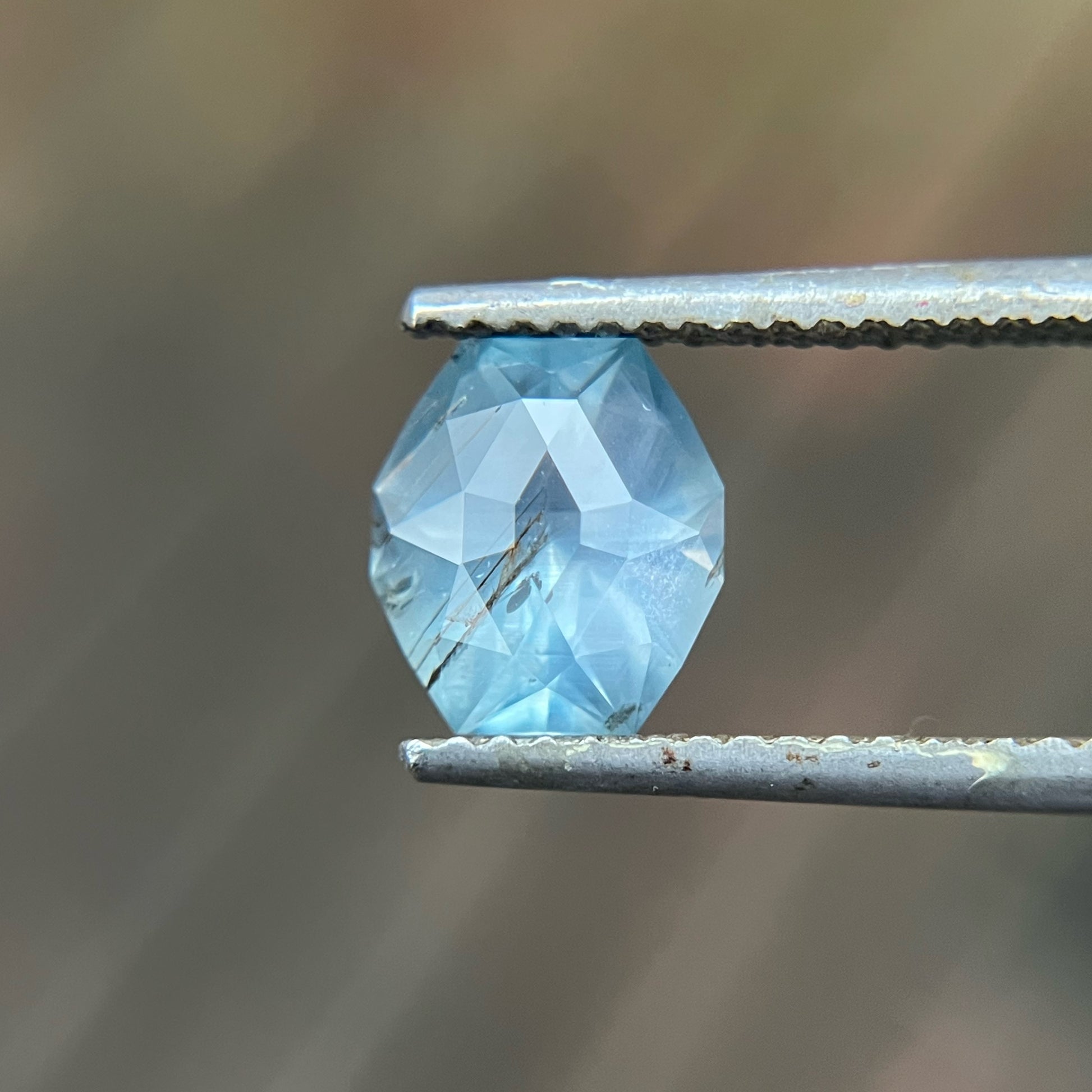 Unheated Montana Sapphire in an original design, this piece has a beautiful sleepy blue and a couple of needle inclusions which make it super unique! Perfect for that engagement ring!