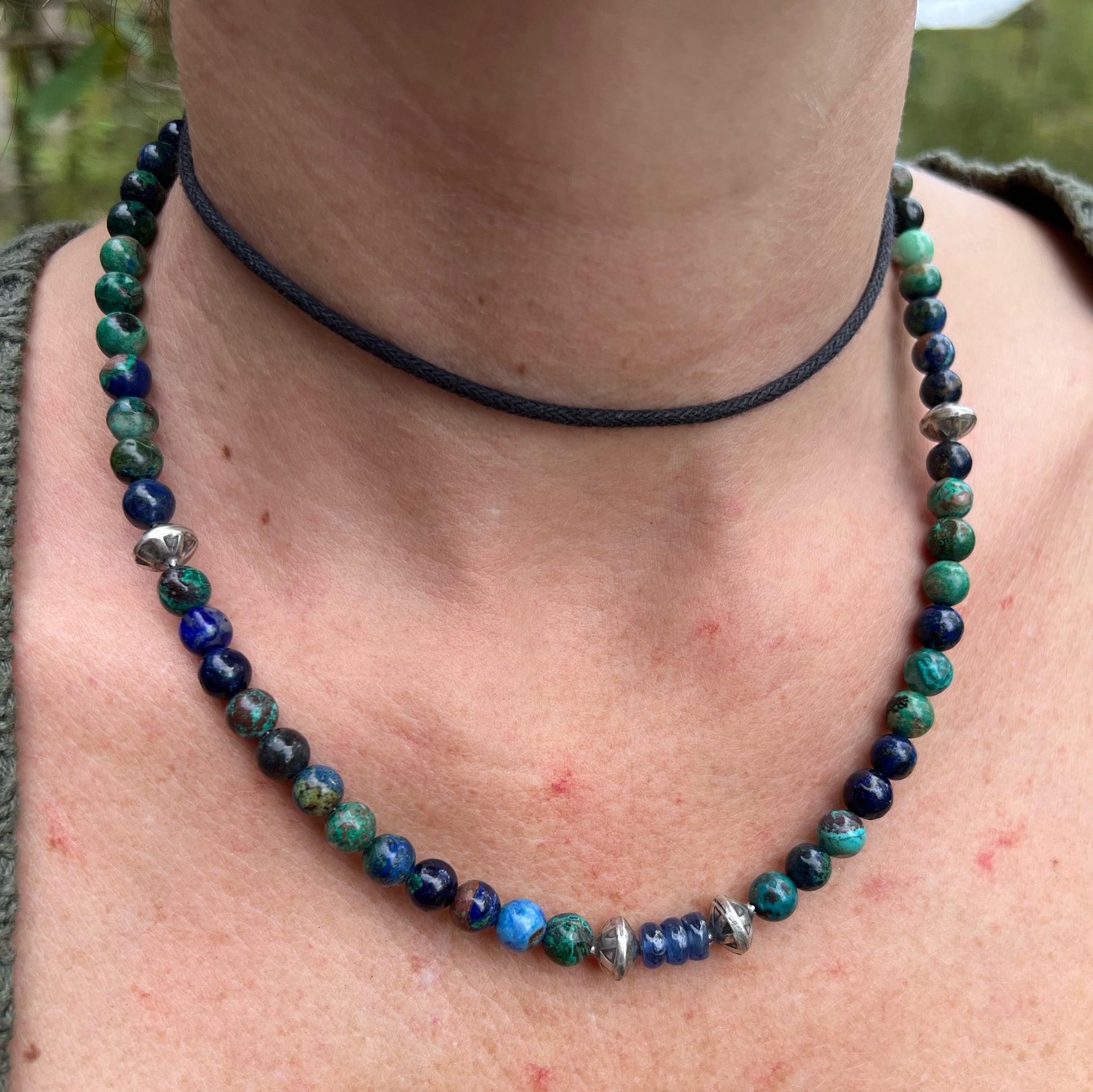 Azurite and Malachite with Silver Handmade Pearls Beaded Necklace with Sterling Silver Clasp Jewelry