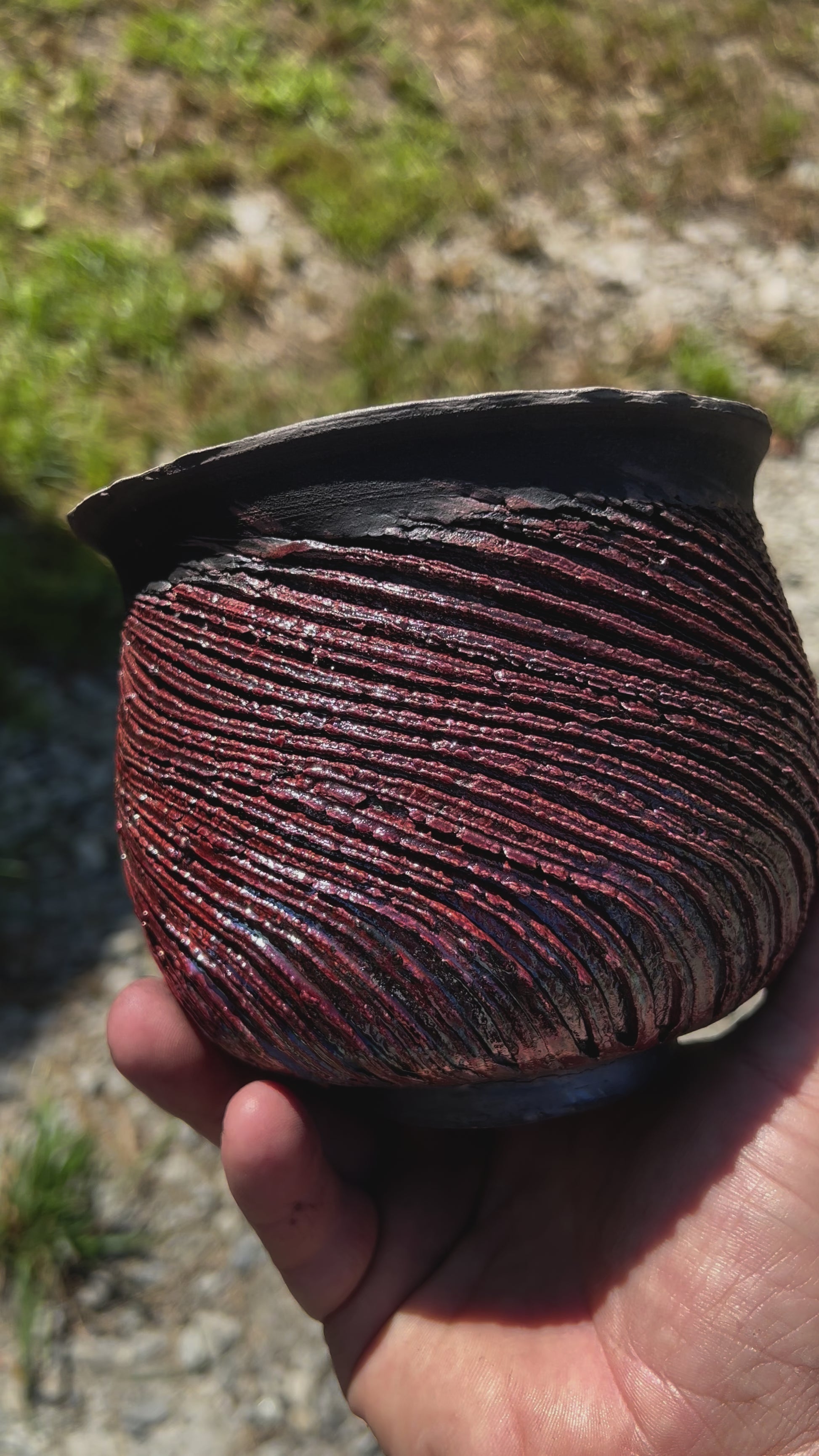 Raku fired vase with a very unique spiraling texture, beautiful copper with deep red notes in the color, the interior is finished in a wonderful crackle finish.