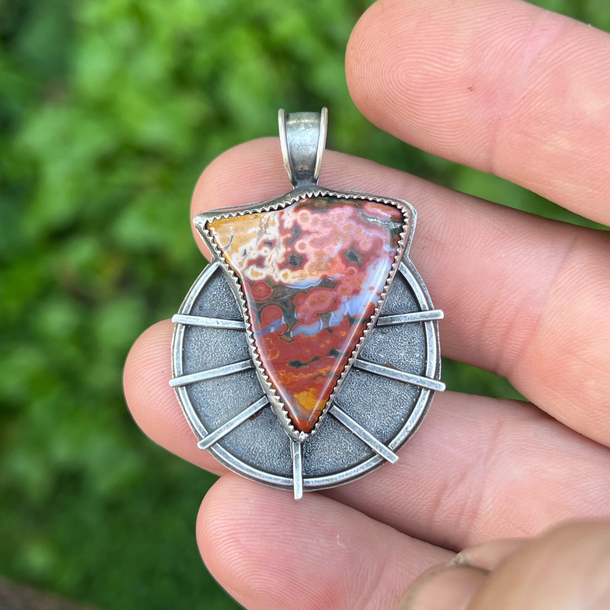 Super colorful Ocean Jasper with great orbs. Hand made and fabricated in sterling silver by me.