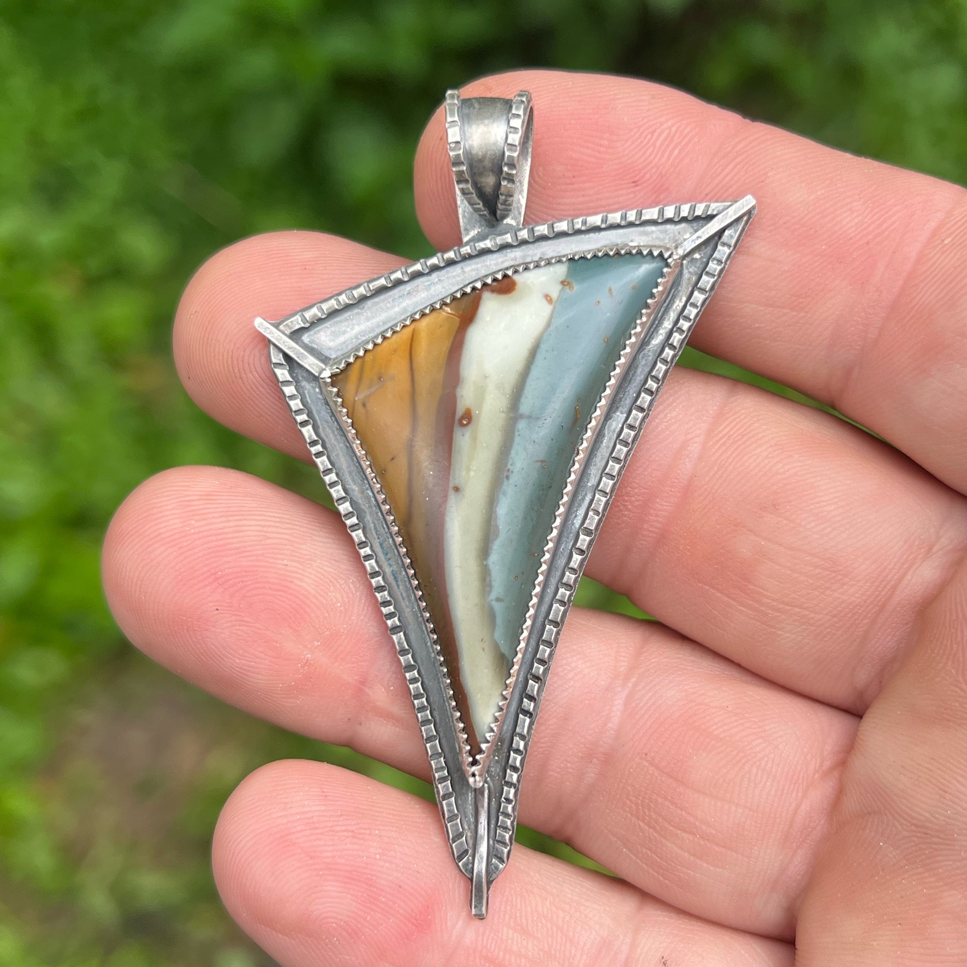 Love the blue and tan combo of the stone, it embraces the earth tones of the material while showing off a great color combo. Hand made and fabricated in sterling silver by me.