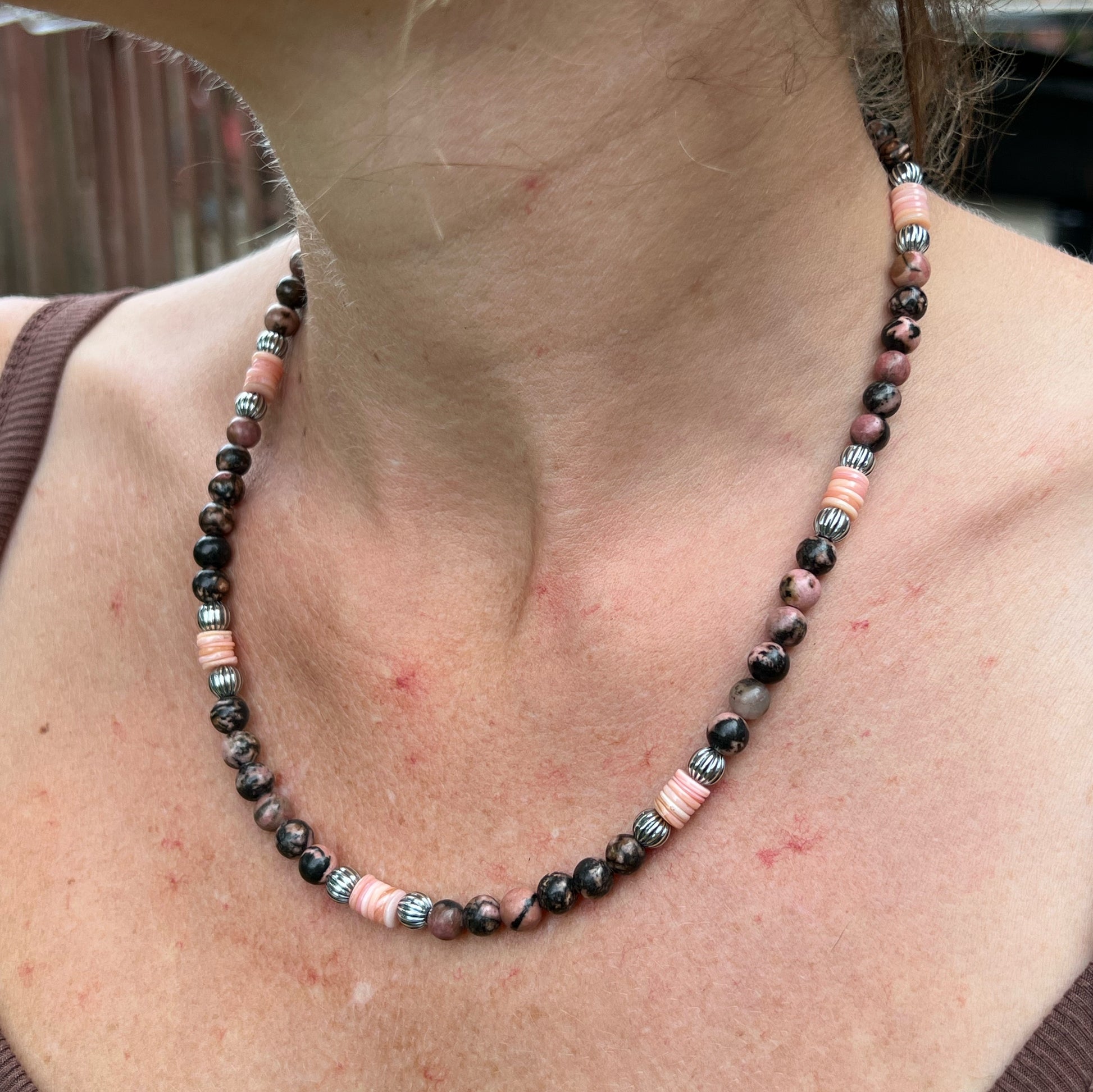 Rhodonite Pink Conch and Silver Beaded Necklace with Sterling Silver Clasp Jewelry