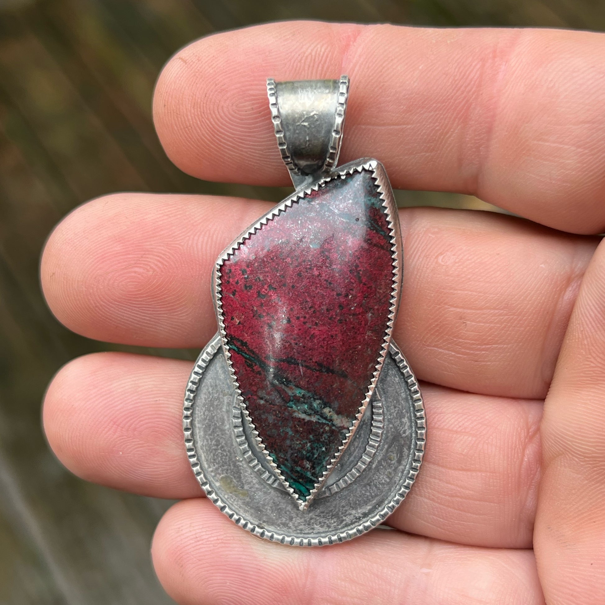 Ypu really can’t beat the deep burgundy and teal in the material. Hand made and fabricated in sterling silver by me.