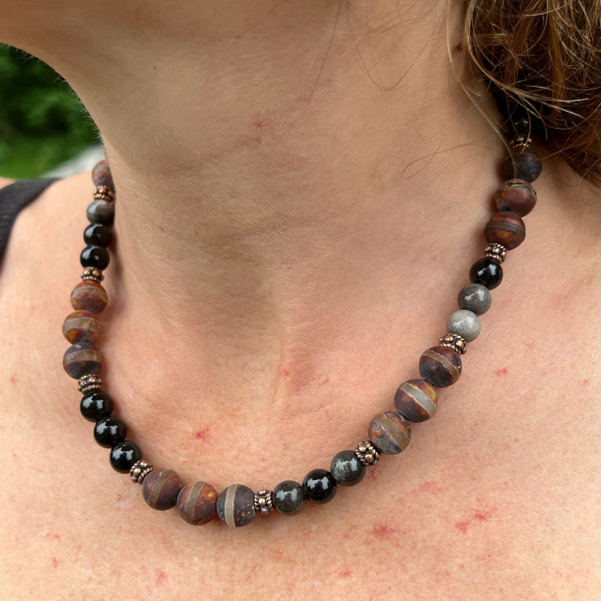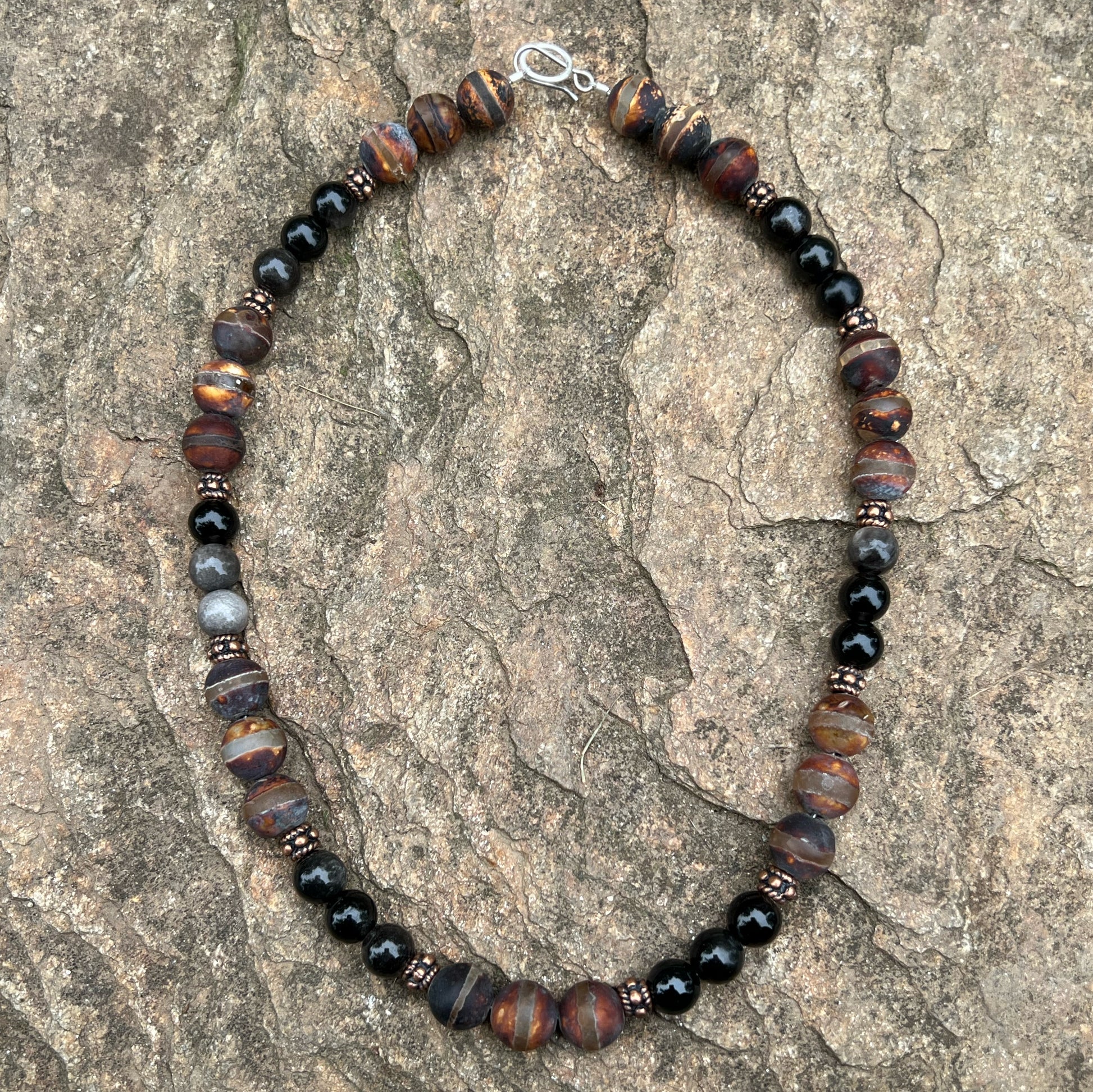 Tibetan Frosted Dark Walnut Line Agate with Silver Sheen Obsidian and Copper Accents Beaded Necklace with Sterling Silver Clasp Jewelry