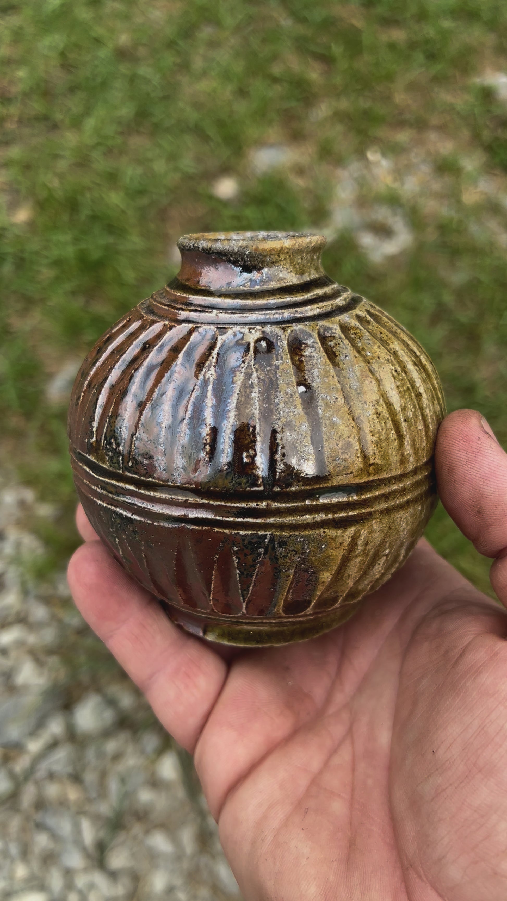 Cool little carved bud vase, with a hint of mortar that fell off the kiln during the firing.